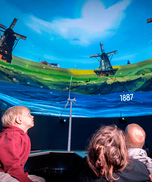 Oplev også den store full dome oplevelse, hvor du bliver taget på en rejse gennem vindmøllernes og vindkraftens historie - fra middelalderens stubmøller til de gigantiske havvindmøller.